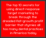 Learn the Top 10 Secrets for using direct-response target marketing to break through the dreaded flat-growth profit barrier that stymies all too many dentists in America today.